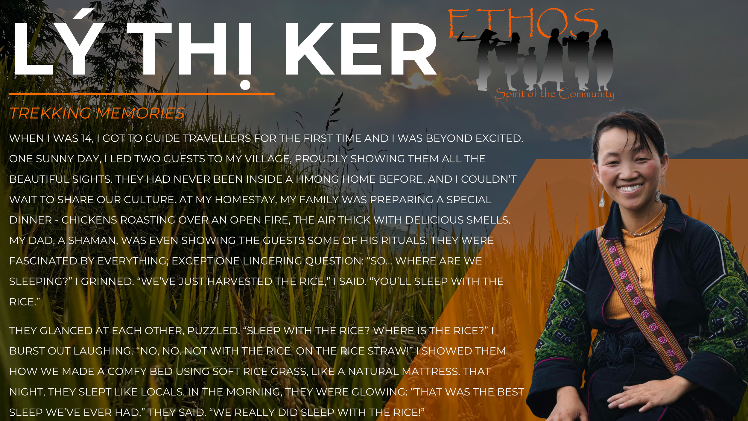 an ETHOS trekking guide in Sapa, Vietnam, wearing traditional [Hmong/Dao] dress and sharing cultural stories with visitors.