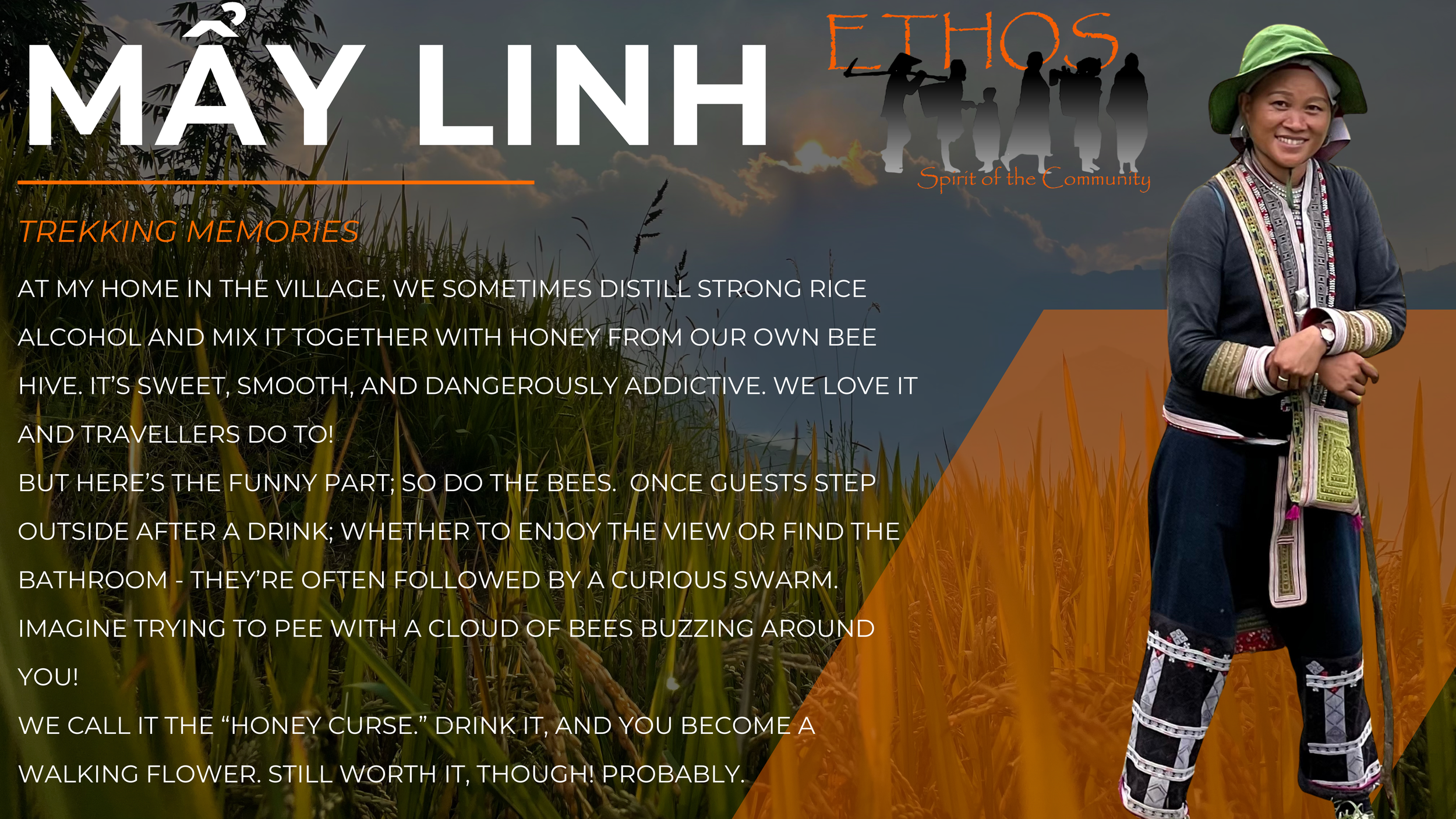 an ETHOS trekking guide in Sapa, Vietnam, wearing traditional [Hmong/Dao] dress and sharing cultural stories with visitors.