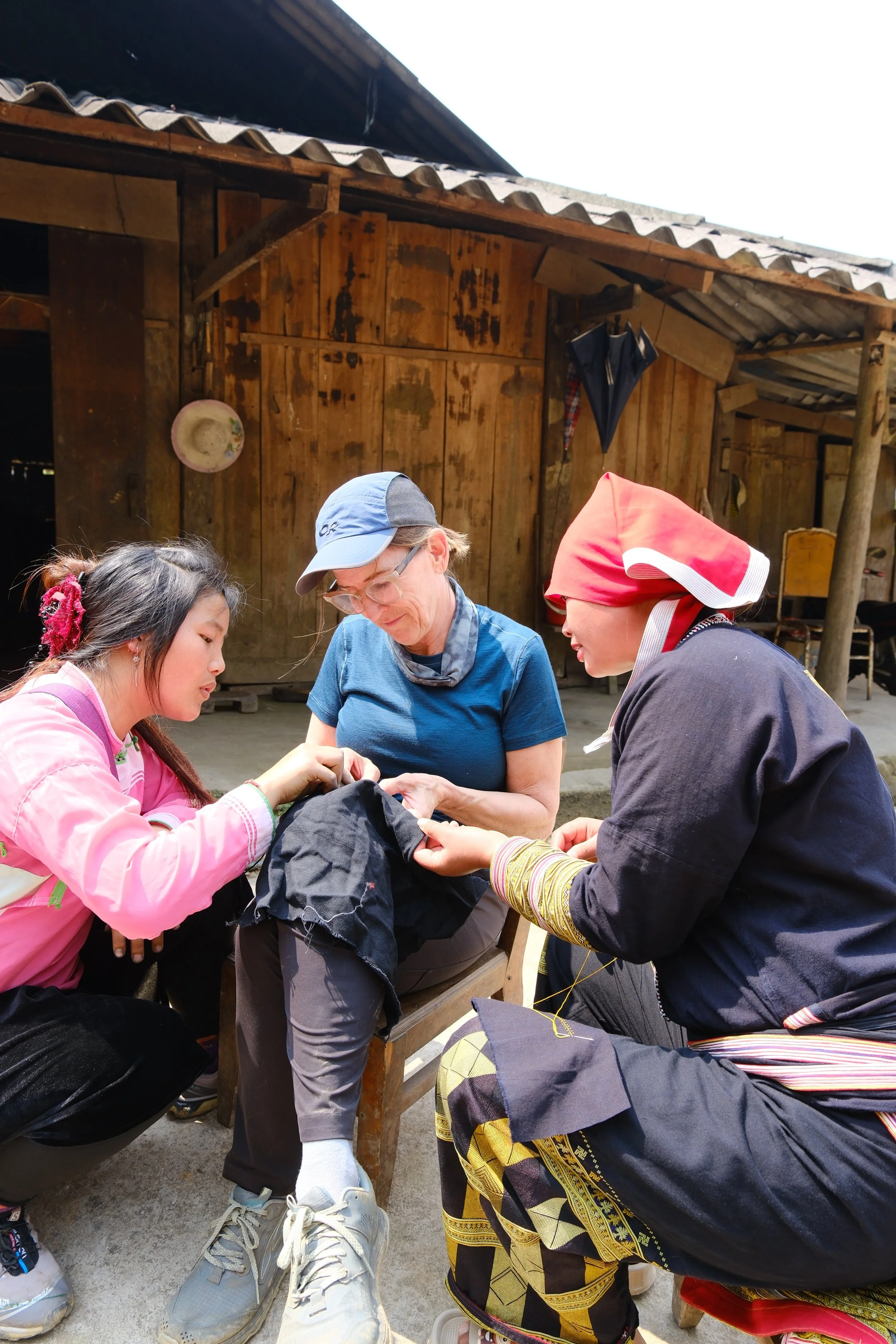Workshops use traditional cotton fabrics, silk threads and Dao needles. The fabric is hand spund and hand woven and has a tight weave and small holes. Needles are far smaller than most ethnic groups in Vietnam too meaning the work of the Dao is finer and more intricate. It is this that sets their work apart and has earnt the Dao a repulation of being excuisite needleworkers. Good hand eye coordination is essential for our workshops, as is the need for patience and dexterity. A days workshop will usual yeald an outcome that is small, testiment to the time taken to produce a full set of clothes.