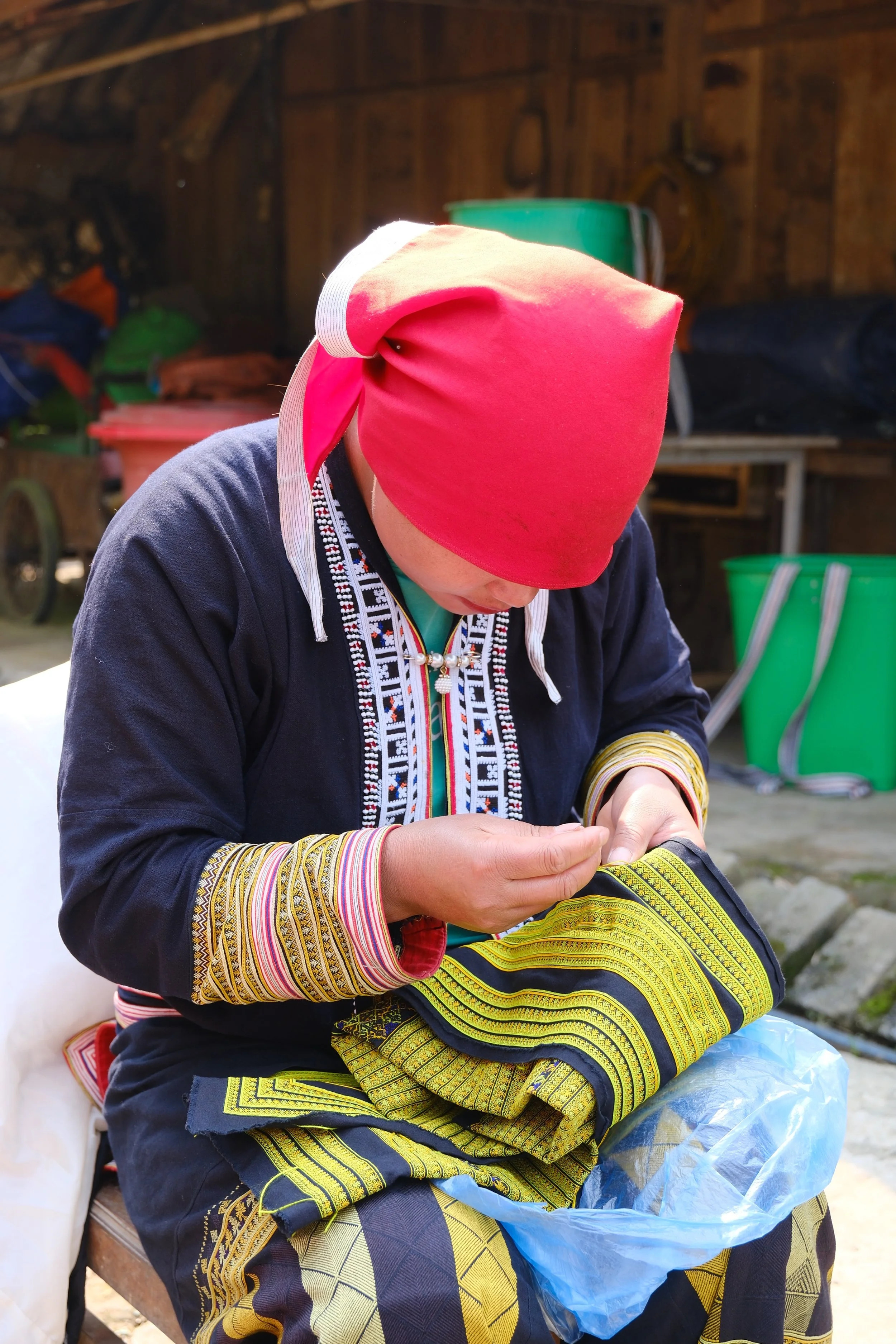 The embroidery is completed in lines, using the full length of the needle, and it is quite unique in that a design appears on both sides of the fabric. Embroidery skills are extremely important in ethnic minority life. A woman’s outfit includes a heavily embroidered tunic, apron, and pants, as well as embroidered accessories. A traditional outfit can take up to a year and a half to produce and the embroidery skills take many years to master. Traditional clothing is still worn daily by most Dao women. This means that women take their embroidery with them wherever they go, working on it whenever they have a free moment.No Red Dao women is seen as fit to marry or even desirable until she has sewn her own clothes.