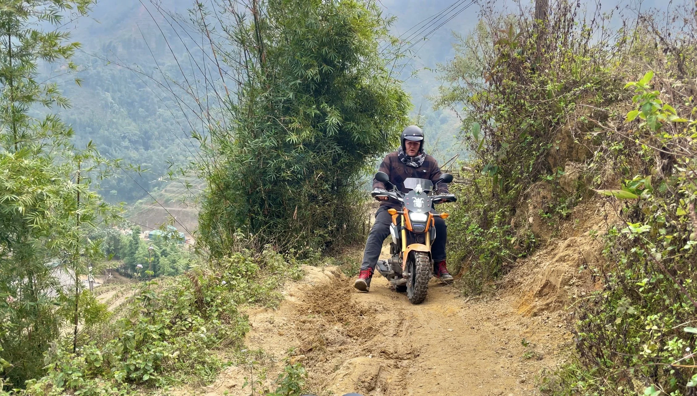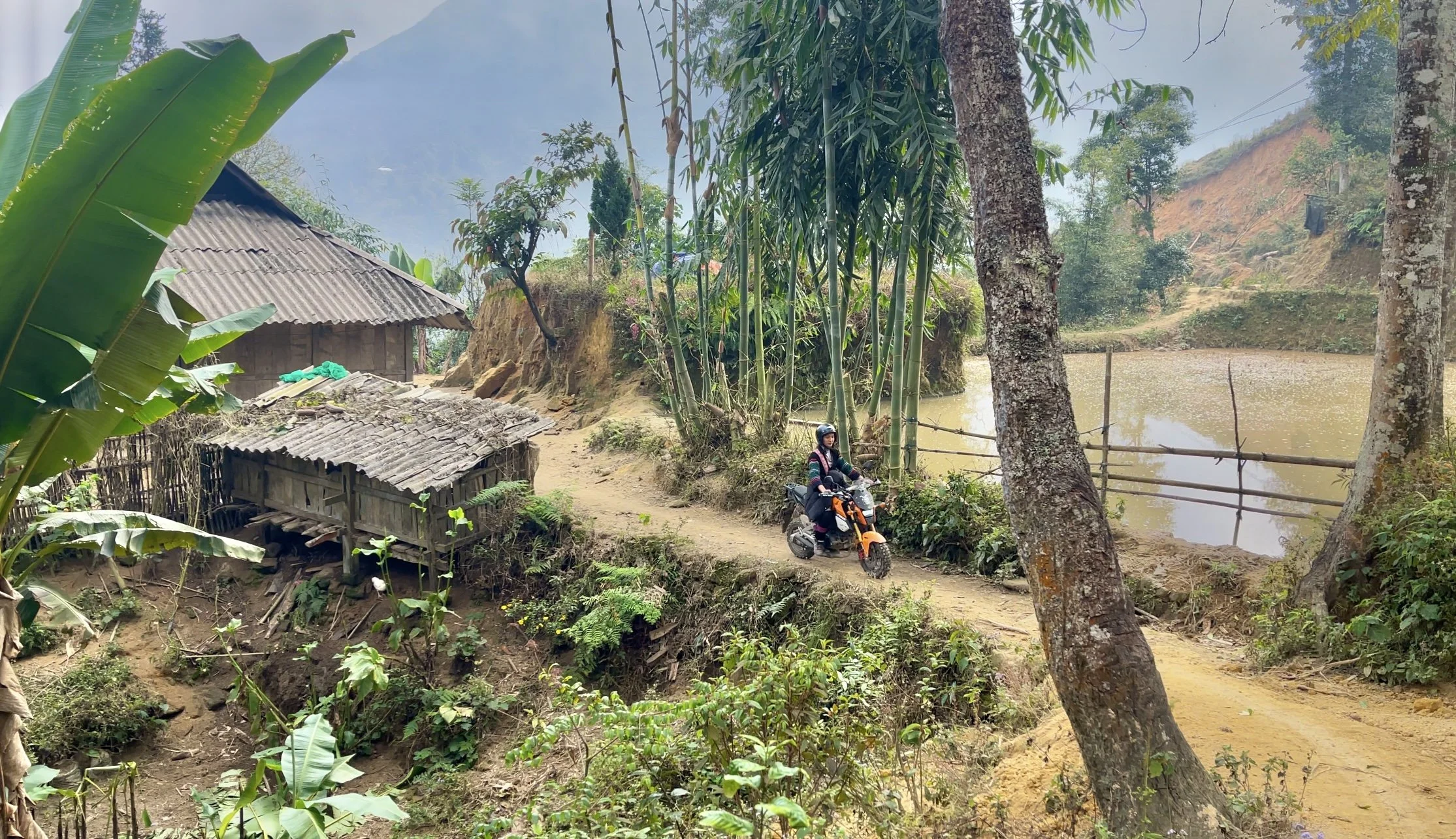 From here, we climb back up the mountain. The route becomes a dirt track with steep sections and muddy corners, winding through wild, untouched hillsides. It’s a challenging ride, only suitable for those comfortable on manual bikes, but the reward is worth every bump. Along the way, we pass through a remote mountain village that feels tucked away from time. It’s a place where roofs are low, smiles are wide, and the mountains hold their own kind of silence.