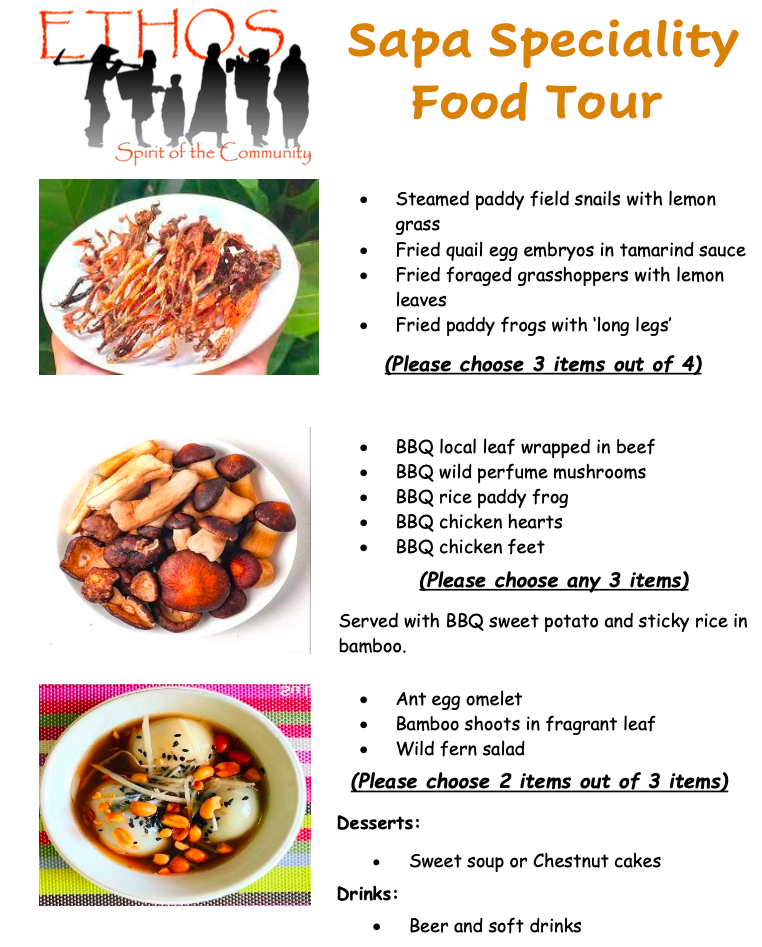With a complex geopolitical history, the people of the northern Vietnamese highlands have shown great resilience and creativity to overcome hardship. This is evident in day to day life and reflected in the food which is both exotic and highly varied. Our street food tour takes in some of the more unusual Sapa foods, many of which are foraged from the forest or collected in and around the rice paddies. Our tour offers a variety of local dishes presented in the traditional style.
