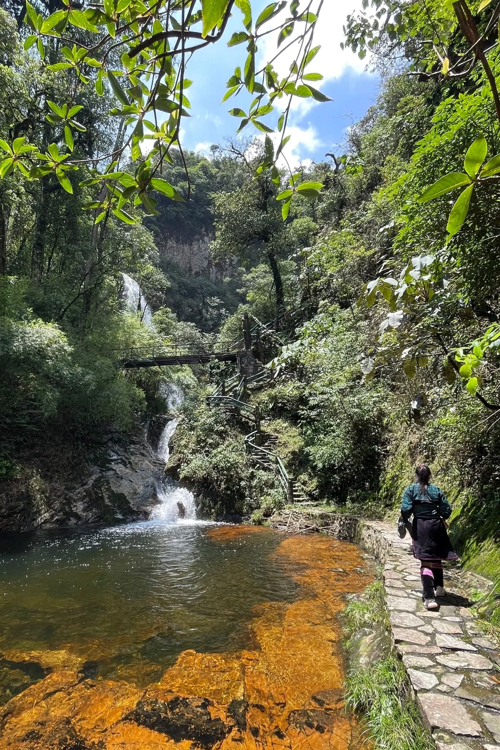 The approach to the waterfall follows a well maintained stone trail that winds for about two kilometres through the forest. It is an easy walk, shaded and steady, with no guide required. The forest here is part the Hoang Lien Son range, and if you move quietly you may notice more than just trees: bright birds darting across the path, the croak of frogs, or a lizard basking on a rock.