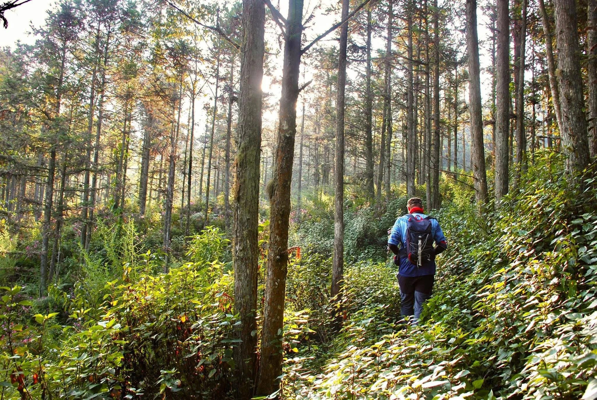 Cool, shaded paths weaving through pine forests and deciduous woodland