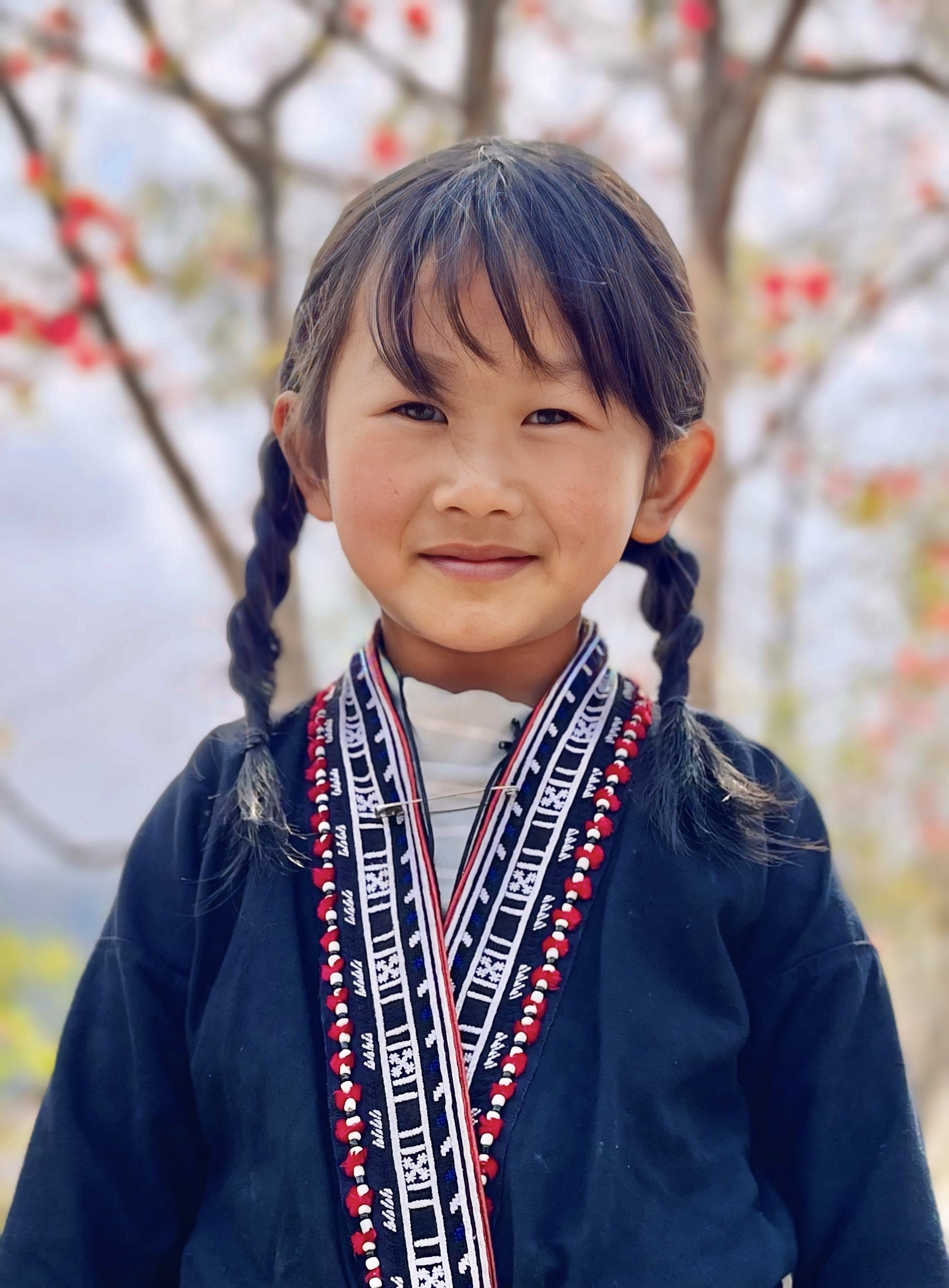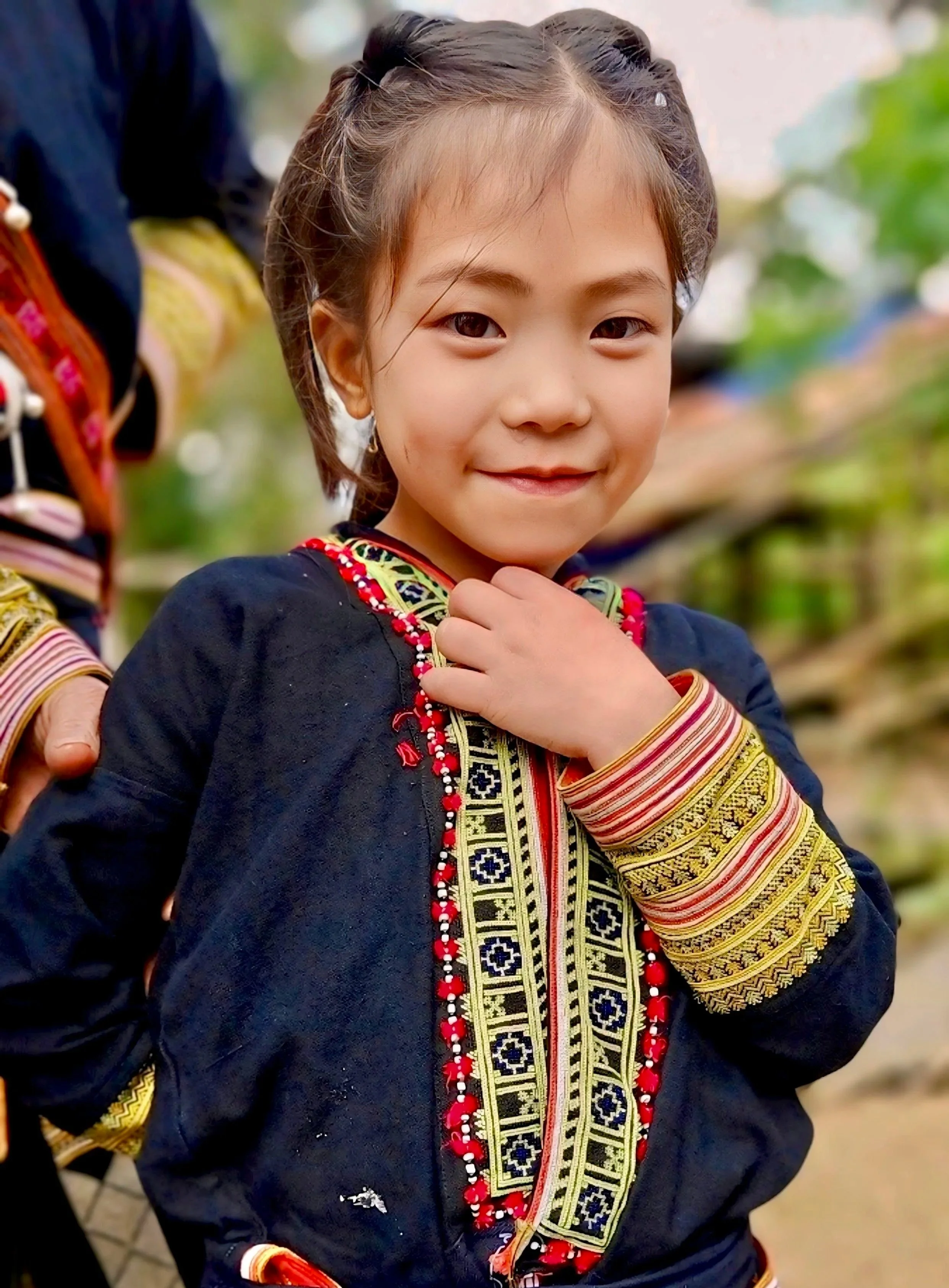 A Red Dao child in traditional indigo clothing with colourful embroidered trim, dressed for Tết celebrations in a mountain village.