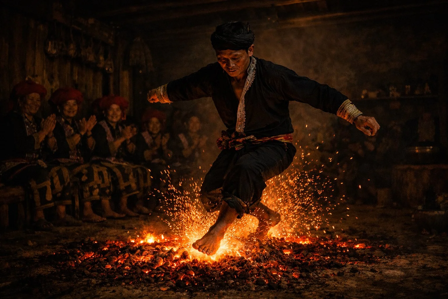 Red Dao man dancing on embers in a family home.