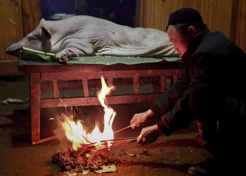 The earliest moments of the New Year are domestic and spiritual. The ancestral altar is carefully prepared. Incense is lit. Offerings are made to ancestors and household spirits. A pig is often central to these rites, first presented in prayer before becoming part of the shared meal. The fire symbolises continuity and protection. The house becomes the place where the old year is formally closed and the new one welcomed through ritual order.