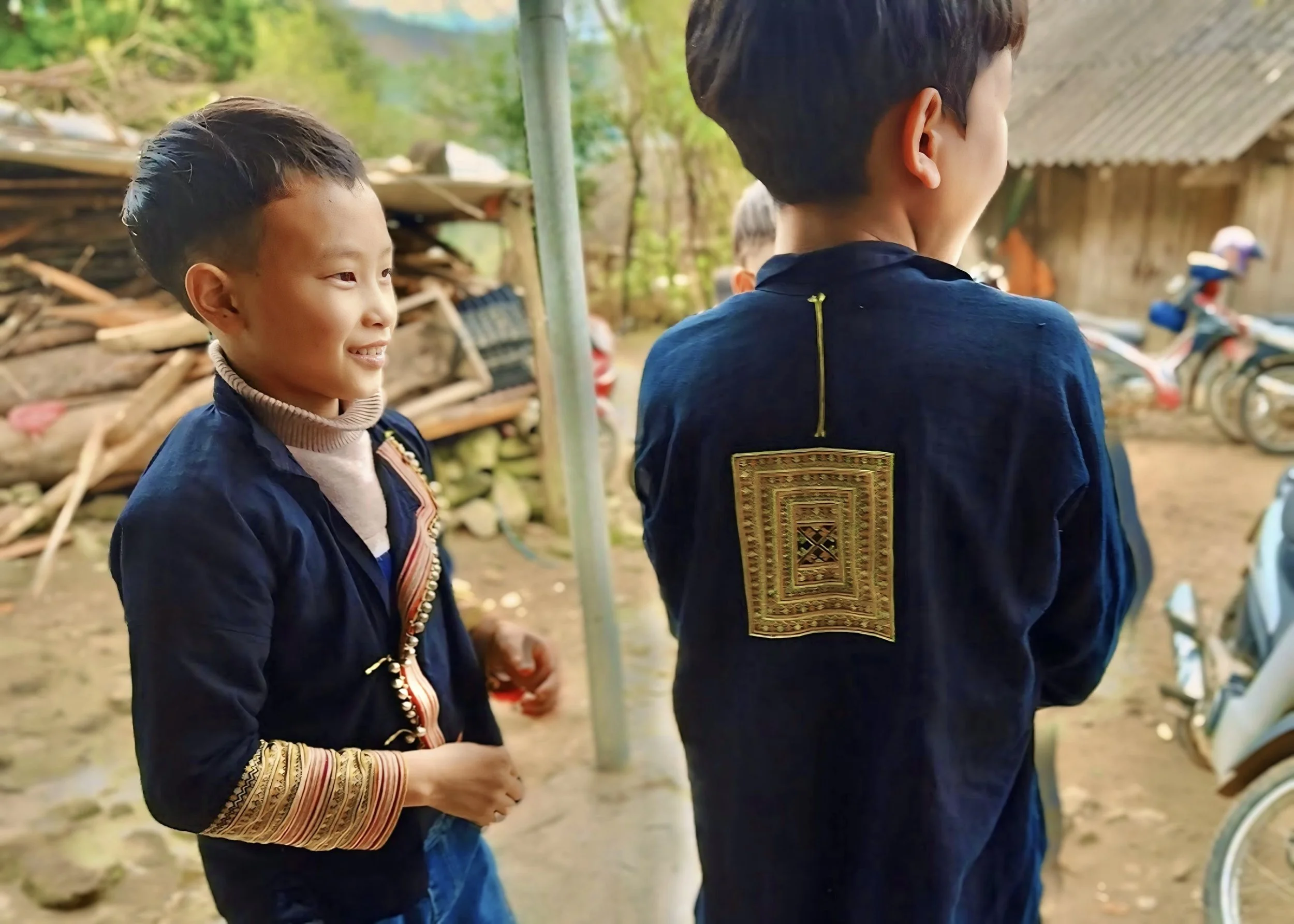 Red Dao boys wearing indigo traditional clothing with embroidered detail, preparing for the New Year celebrations in a mountain village in Sapa.