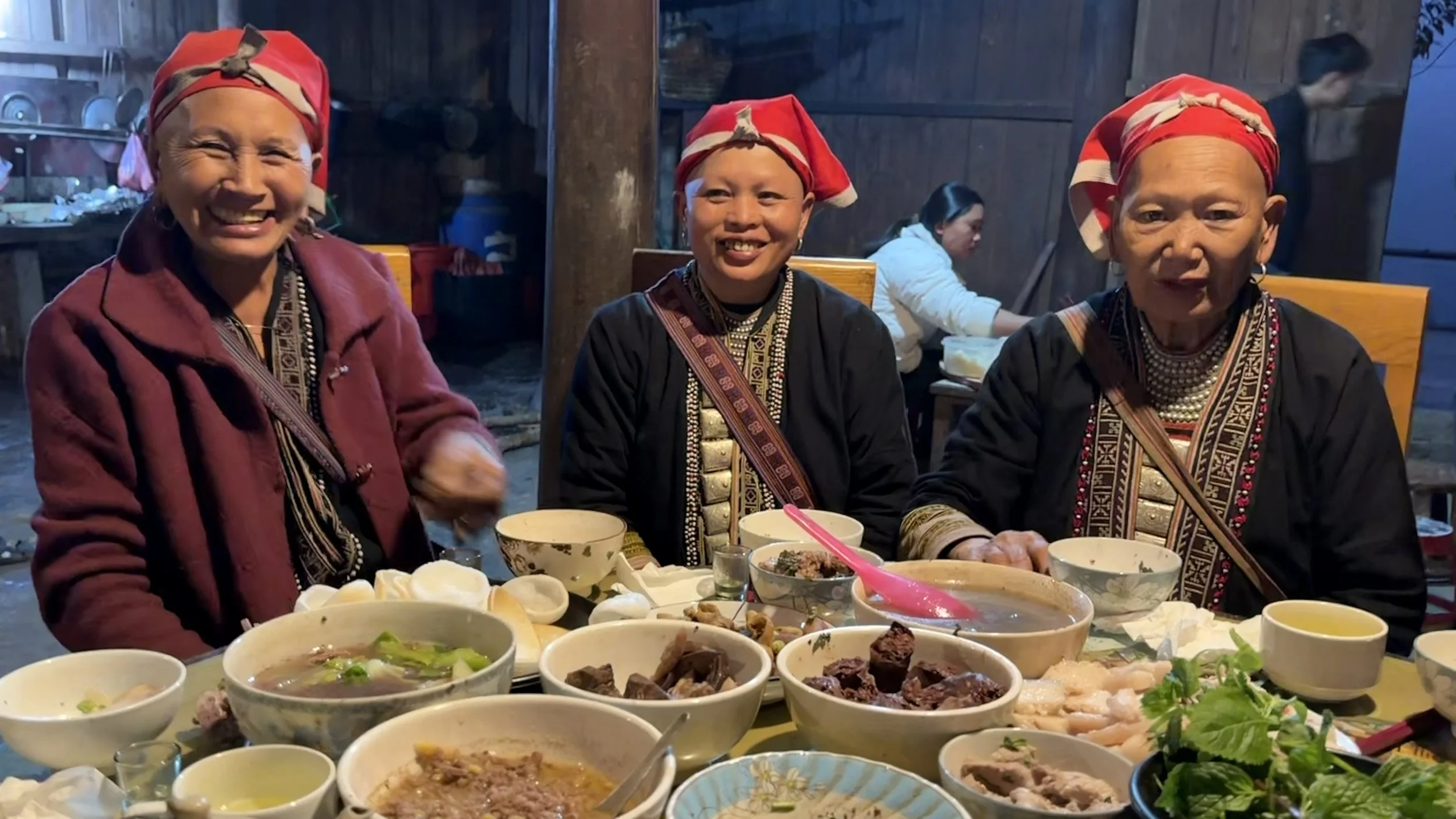 Three Red Dao women wearing embroidered clothing sit together at a table covered with home-cooked dishes. They smile warmly in a dimly lit wooden interior, with bowls of soup, meat, and herbs arranged in front of them, capturing a moment of hospitality and shared celebration during the New Year meal.