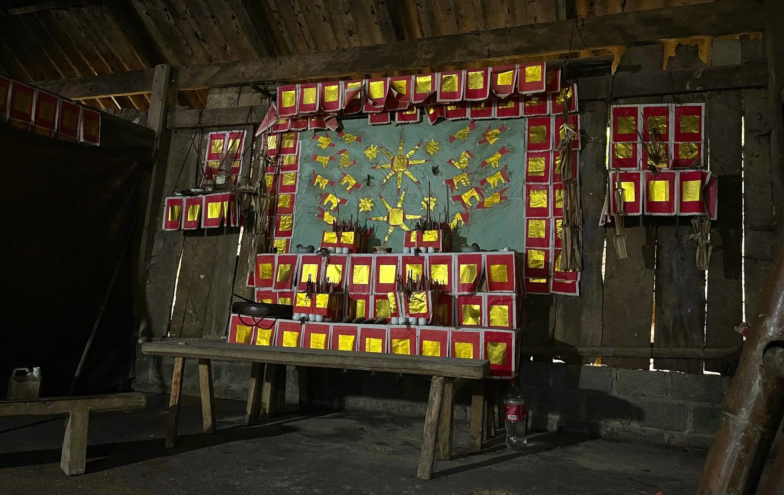 A pyre is built from old ritual papers. As chanting intensifies and gongs grow louder, the shaman rolls through the embers, sending sparks into the air. Others follow, dancing through smoke with stamping feet. Bowls of meat and rice are placed on the altar with cups of distilled rice wine. Food and drink are offered to the spirits before the communal feast begins. The ceremony ends in shared eating, storytelling and laughter long into the night.