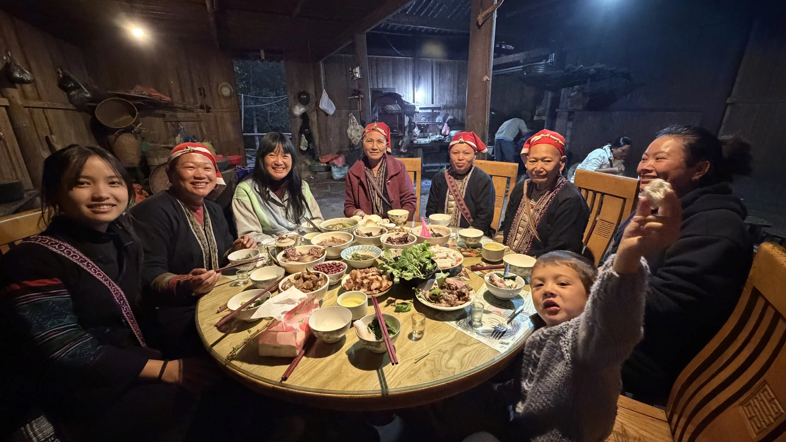 A multi-generational Red Dao family sharing a festive meal. The setting feels intimate and celebratory, reflecting the first communal feast of the New Year.