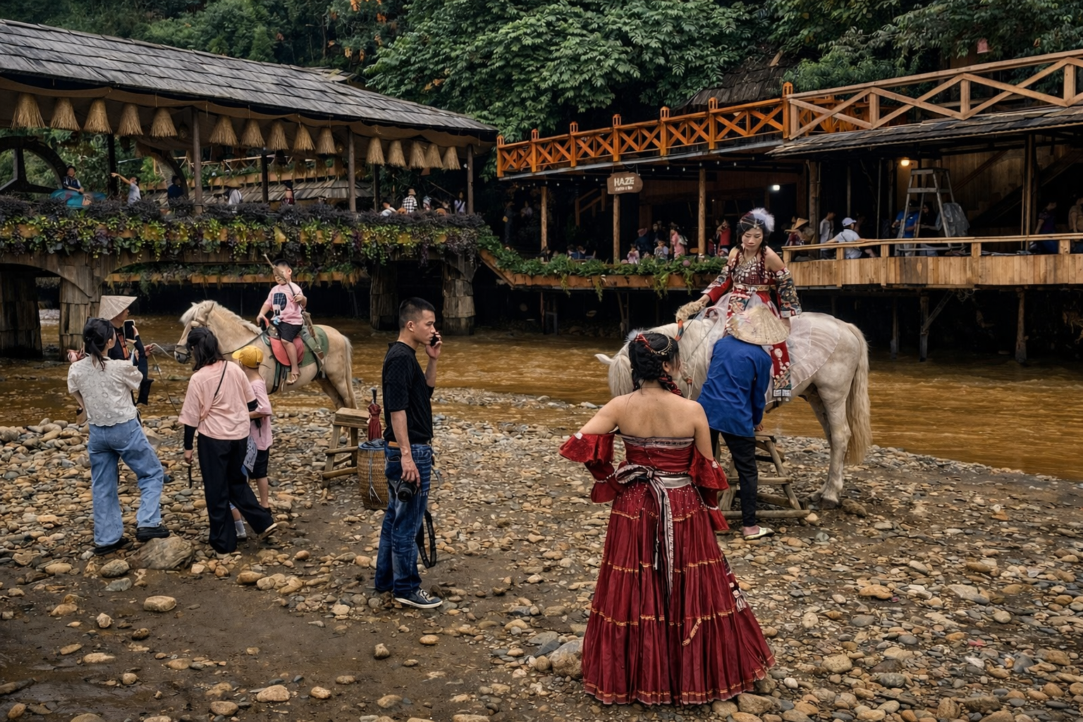 In nearby Cat Cat village, another ritual unfolds. Visitors rent traditional ethnic clothing, garments that once reflected identity, ancestry, and belonging. They wear them briefly, walking through Cat Cat, pausing for carefully composed images. Then they return them and leave. Is this appreciation or appropriation?