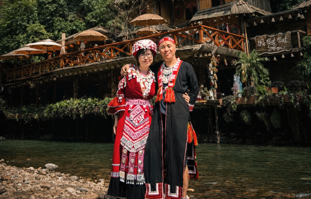 Travellers taking curated photos in factory made, replica Hmong style clothing, rented for selfies.