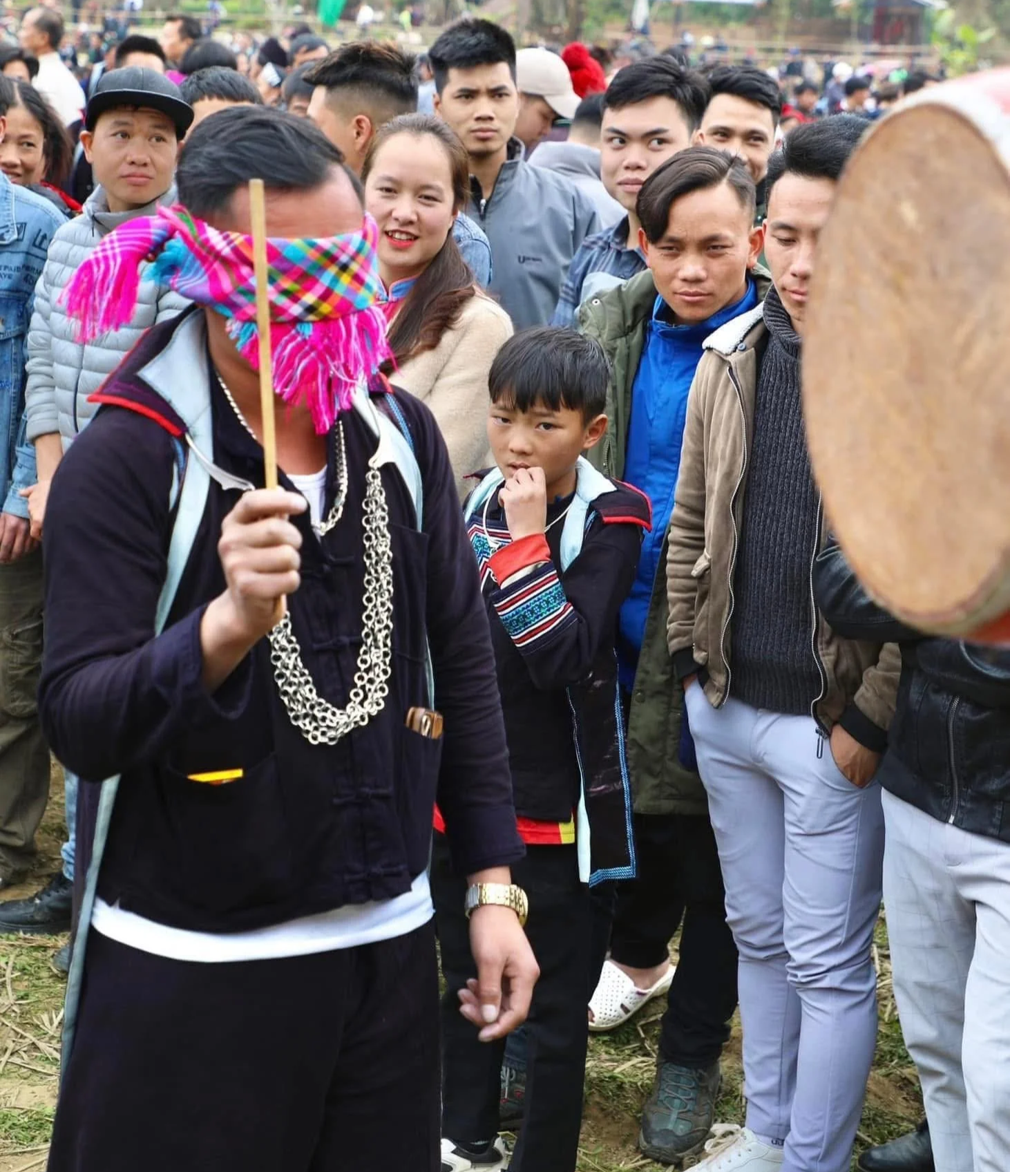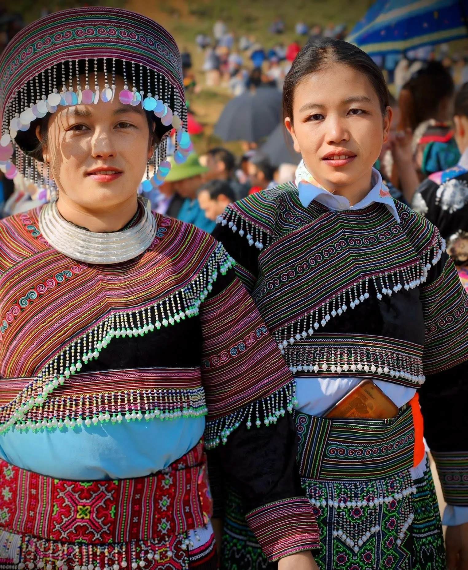 Traditional clothing is an essential part of Tết. Women wear indigo tunics richly embroidered with bright patterns, black trousers decorated with geometric stitching, and the iconic red headscarf with tassels and silver jewellery. Men wear indigo jackets with red accents and headscarves.