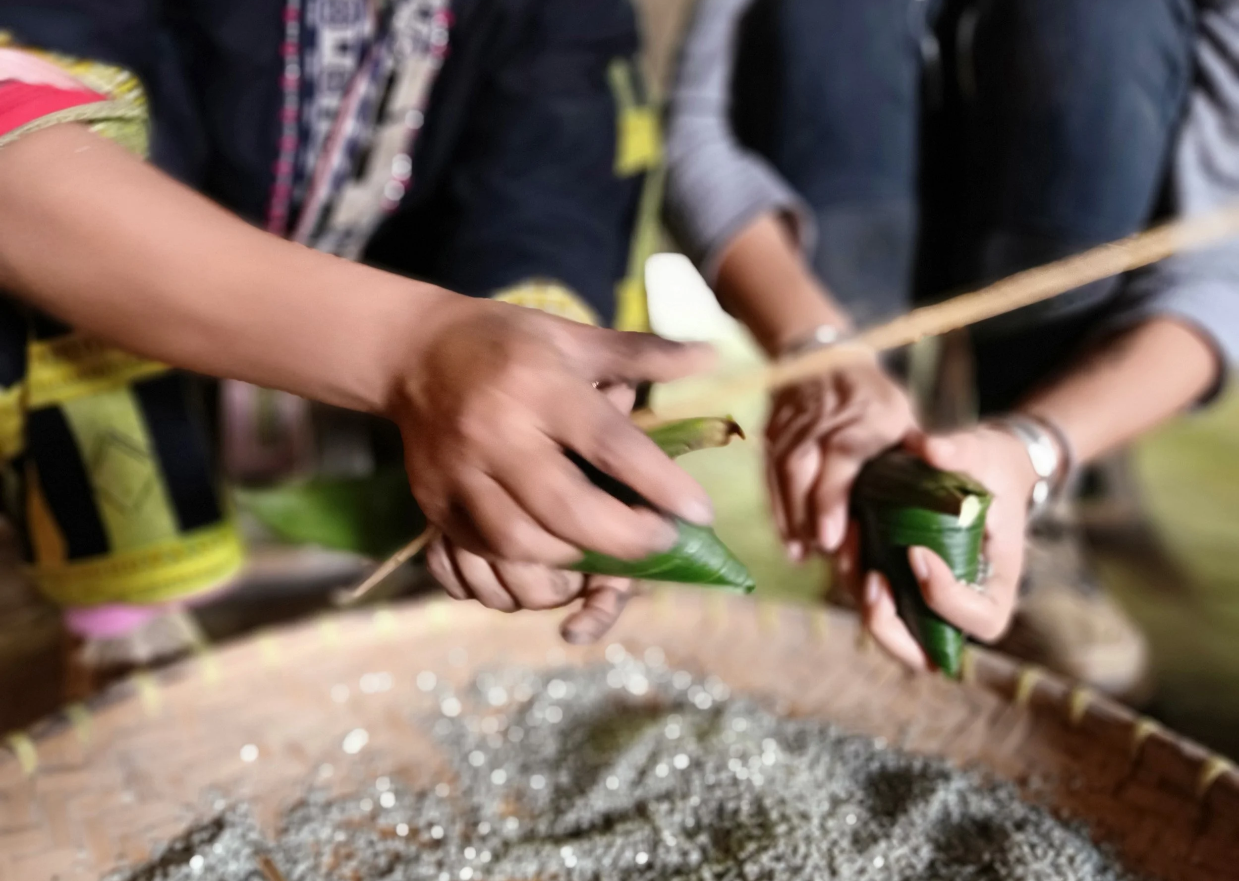 Hands wrapping bánh chưng gù, the Red Dao humpback sticky rice cake, in forest leaves as part of New Year food preparations.