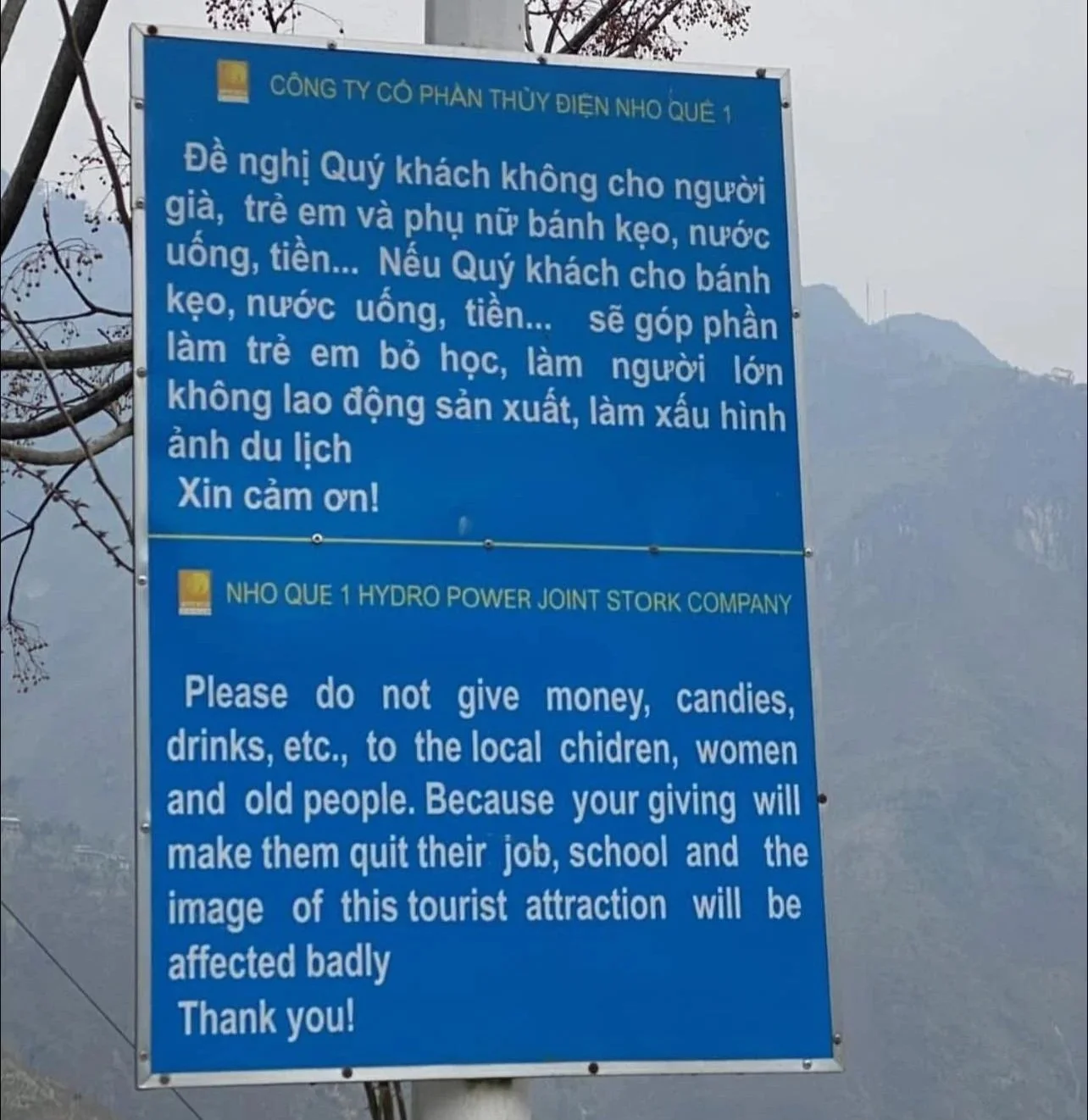 A new public notice has been erected near the Nho Que River along the Ha Giang Loop. It asks visitors not to give money, sweets, or drinks to local children, women, and elderly people, warning that such actions may discourage schooling and work, and negatively affect the image of tourism.